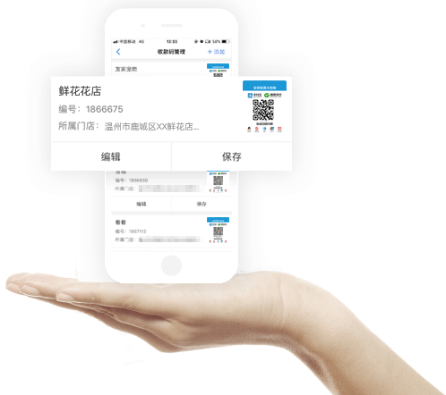 收款码台卡可放置于收银台,也可拿到顾客面前完成收款,收款码贴纸可张贴于店铺各处收款